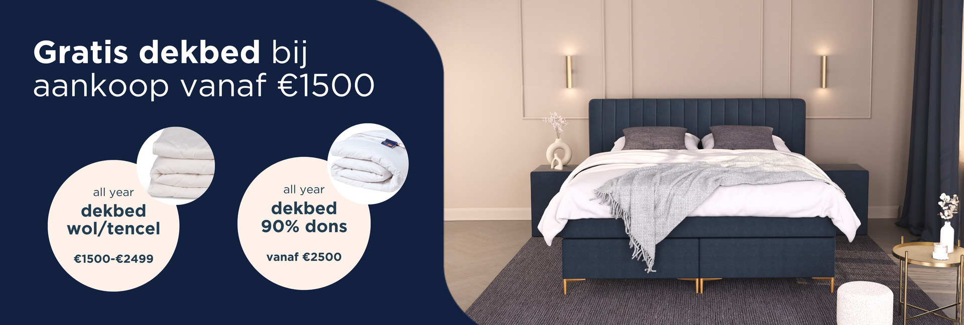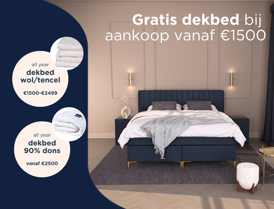 - Bij (deel)retournering van de order waardoor het aankoopbedrag onder de €1500,- komt, vervalt het recht op het gratis dekbed. De waarde van het dekbed zal dan worden verrekend met het retourbedrag.