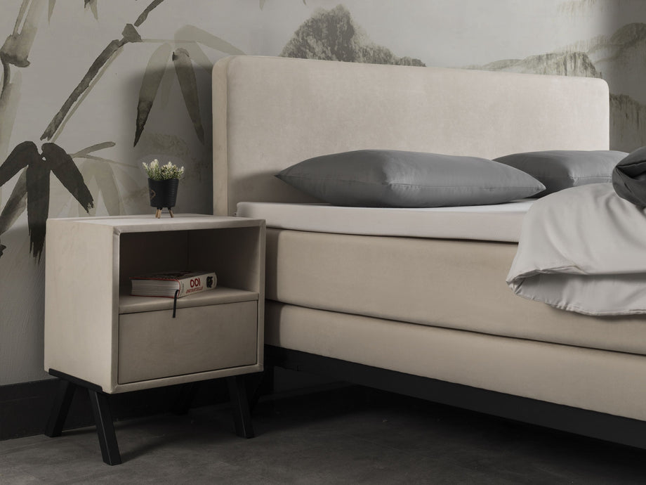 Boxspring Calais heeft een moderne uitstraling, dankzij het metalen frame en pootjes. Het slanke hoofdbord met afgeronde randen zorgt voor een luchtig geheel. Calais is verkrijgbaar in verschillende kleuren, afmetingen, stoffering en type pootjes. Calais is ook leverbaar in een elektrische uitvoering.