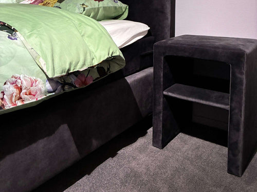 De set is volledig samengesteld zoals getoond in de winkel en wordt geleverd inclusief twee nachtkastjes en een voetenbank uit de Sandness-serie. Omdat dit een showroommodel is, is het niet aanpasbaar. Je haalt de set zelf op bij de winkel, waar je ook advies krijgt over demontage en transport.