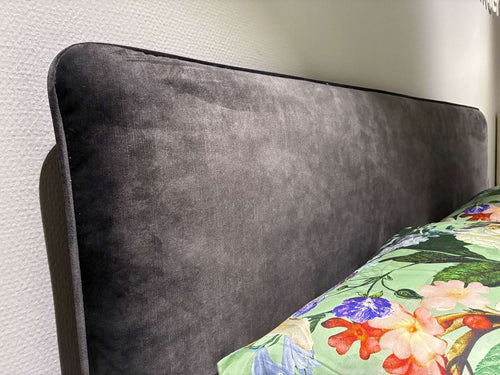 Boxspring Dramman straalt rust en eenvoud uit. Het hoofdbord met afgeronde hoeken en zachte lijnen geeft het bed een minimalistische en tijdloze uitstraling. Deze showroomset is bekleed met rijke veloursstof uit de Adore-serie en uitgevoerd in een ruime maat van 180 bij 210 centimeter. Het stevige Scandinavisch houten frame vormt de basis voor een vlakke boxspring met een instaphoogte van 70 centimeter.