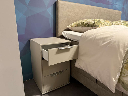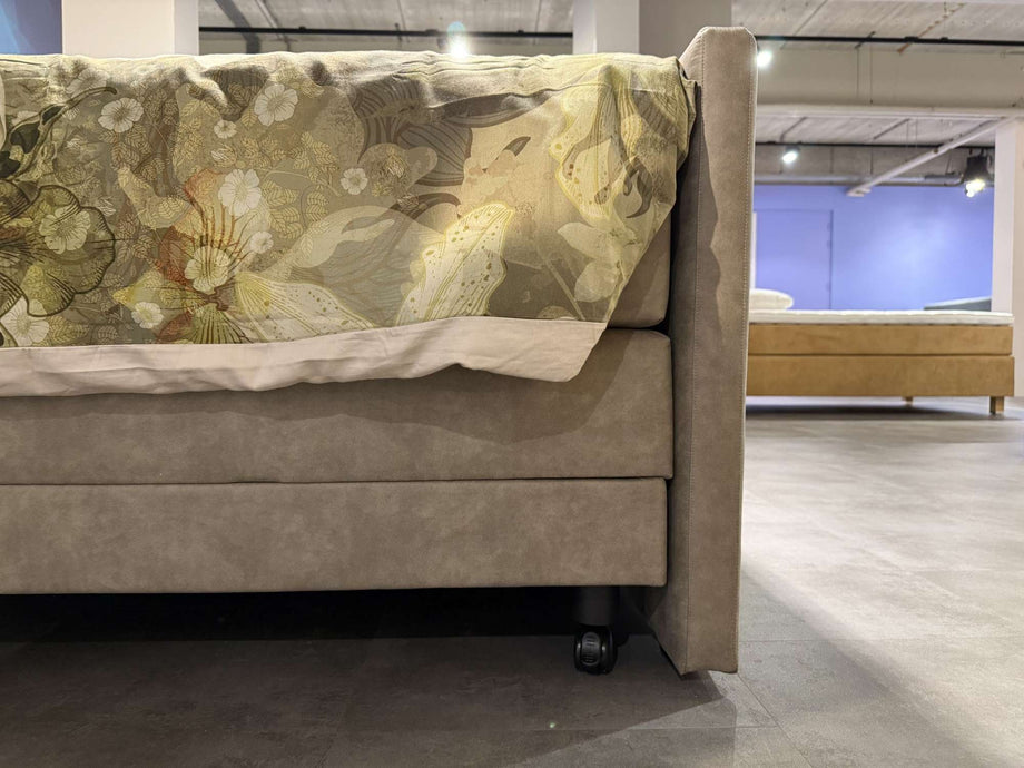 Boxspring Halland wordt aangeboden in het kader van de totale leegverkoop in Arnhem en is direct beschikbaar. In de showroom wordt deze uitvoering geleverd inclusief twee keer nachtkastje Ronda. De boxspring is zelf af te halen bij de winkel en de montage gebeurt in eigen beheer.