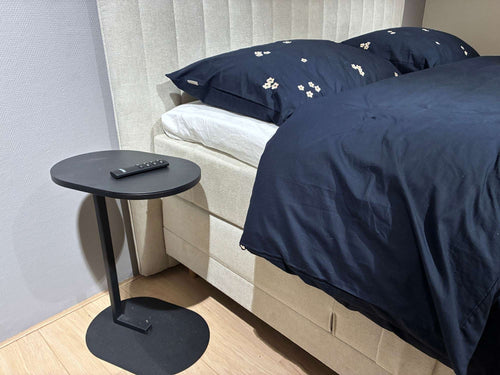 Het Scandinavische houten frame is voorzien van twee stevige pocketveermatrassen met elk 500 veren per vierkante meter, verdeeld over zeven comfortzones. Dit zorgt voor een prettige ondersteuning bij hoofd, schouders, heupen en benen. De HR-40 koudschuim topmatras van 8 centimeter heeft een enkele split en draagt bij aan een stabiel en comfortabel liggevoel. De tijk is afritsbaar en wasbaar. De instaphoogte van 70 centimeter maakt in- en uitstappen comfortabel. De eikenhouten Corfu-poten geven het geheel een verfijnde uitstraling. Bij deze showroomset ontvang je twee nachttafels uit de Bondy-serie.