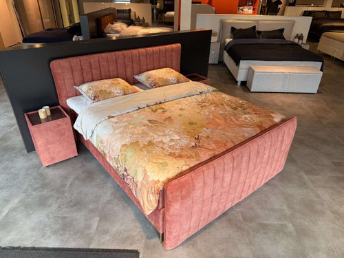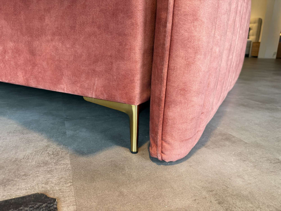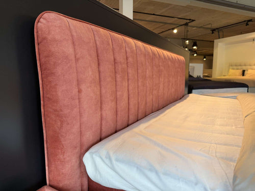 Boxspring Kalix vlak uit de Souplesse collectie straalt minimalistische elegantie uit dankzij het strakke en eenvoudige ontwerp. Het vlakke hoofdbord loopt aan weerszijden 10 cm voorbij het bed, heeft een hoogte van 118 cm en een dikte van 10 cm. Het subtiele lijnenspel van het hoofdbord geeft het geheel een stijlvolle en tijdloze uitstraling. Deze uitvoering is bekleed met roze velours uit de Adore collectie, wat zorgt voor een zachte en eigentijdse look.