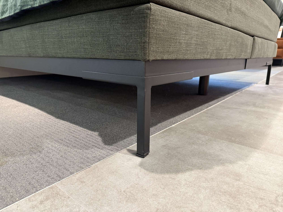Deze vlakke boxspring is opgebouwd op een duurzaam stalen frame en staat op zwarte metalen pootjes type Elegance 710. De constructie is ontworpen voor een gewichtsklasse tot 140 kg. Met een maatvoering van 180 x 200 cm en een instaphoogte van 65 cm biedt dit bed een comfortabele en royale slaapplek voor twee personen.