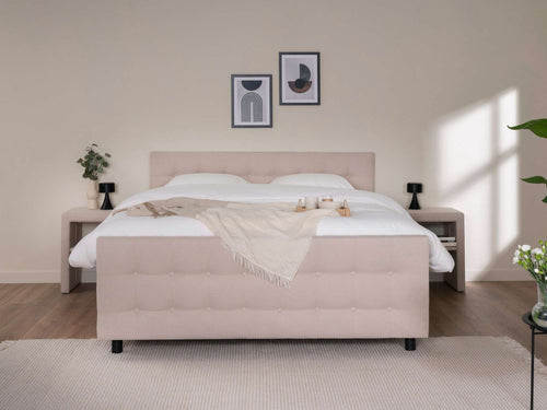 Maak jouw slaapkamer compleet met boxspring Rome. Het romantische hoofdbord van boxspring Rome is doorgestikt en voorzien van stijlvolle noppen. De buitenste rand van het hoofdbord is niet doorgestikt, waardoor deze een omlijsting voor het patroon in het midden vormt. Maak de Rome helemaal af door een eigen kleur, pootjes en bijmeubelen zoals nachtkastjes en een voetbord te kiezen. Jouw droombed in een handomdraai!