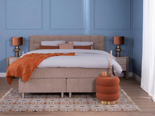 De royale Sundfall boxspring is een echte eyecatcher. De grote vierkante vlakken waarin het hoofdbord is verdeeld, geven de Sundfall een moderne, grafische uitstraling. Niet alleen het gestikte patroon, ook het hoofdbord zelf is vierkant van vorm. Daarmee maak je van de Boxspring Sundfall het smaakvolle middelpunt van je slaapkamer. Je hebt bij deze tijdloze boxspring keuze uit een groot aantal kleuren, stoffen, lederlooks en pootjes.