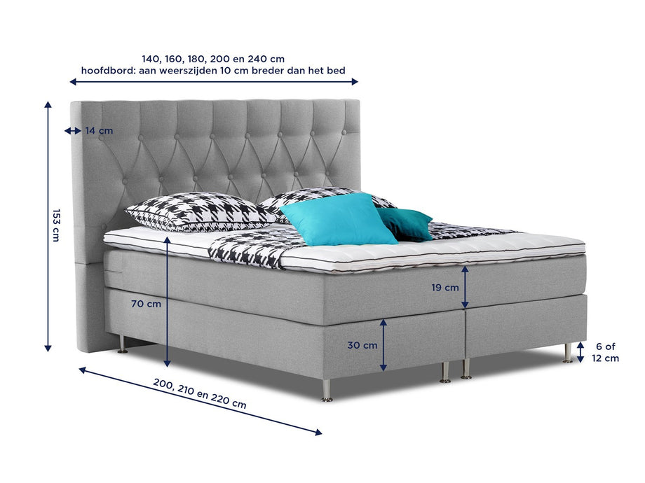 Je slaapt op een combinatie van een pocketveeronderstel met 260 pocketveren per vierkante meter en een pocketveermatras met 300 pocketveren of 500 pocketveren per vierkante meter. Alle boxspringmatrassen zijn uitgerust met zeven comfortzones, voor maximale ondersteuning van onder meer hoofd, schouders, heupen en benen. De kwalitatief hoogwaardige luxe topper maakt de comfortabele ondersteuning voor je lichaam compleet.