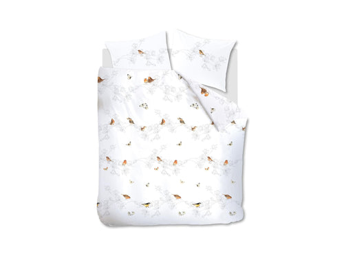 Dekbedovertrek Delicate straalt een verfijnde elegantie uit met zijn frisse witte basis en subtiele illustraties van takjes, vogels en vlinders. Het sierlijke ontwerp met natuurlijke details brengt een vleugje romantiek en lichtheid in je slaapkamer, terwijl de zachte kleuren een kalme en vriendelijke sfeer creëren. Dit maakt het dekbedovertrek perfect voor liefhebbers van een elegante, natuur-geïnspireerde stijl.