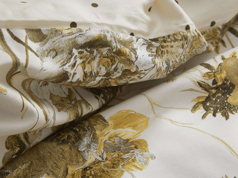 Het dekbedovertrek Maily in de variant Olive is een romantisch overtrek dat direct de aandacht in je slaapkamer opeist. De bloemen in witte, gele en olijfkleurige tinten lijken haast met penseel op het overtrek te zijn geschilderd. Het weelderige bloemendessin, afgebeeld tegen een romige ecru kleurige achtergrond, nodigt uit om lekker onder weg te kruipen. De drukke voorzijde van het overtrek contrasteert met de andere zijde, die is bedrukt met een minimalistisch lichtgrijs stippenpatroon op een effen ecru kleur.