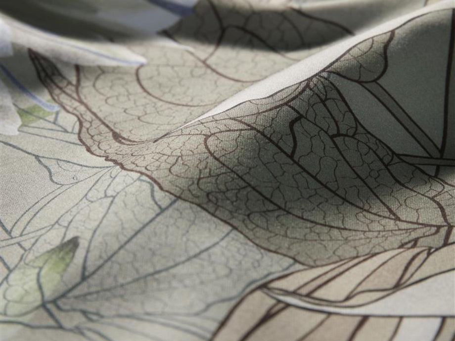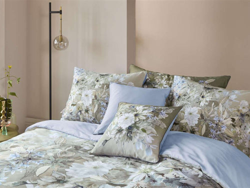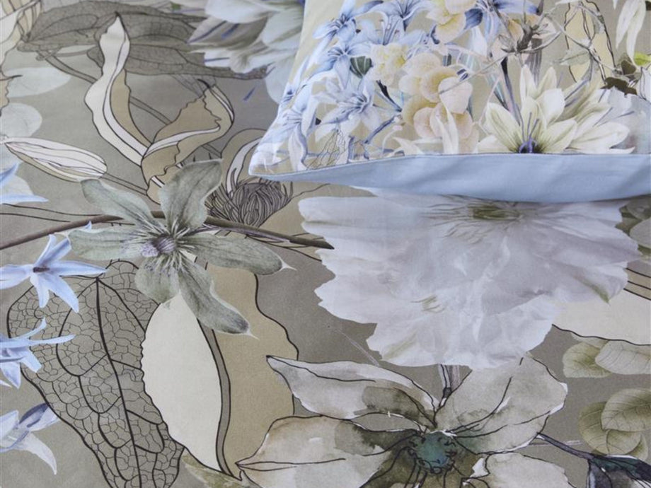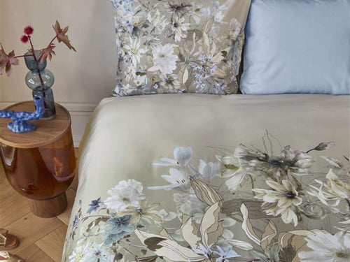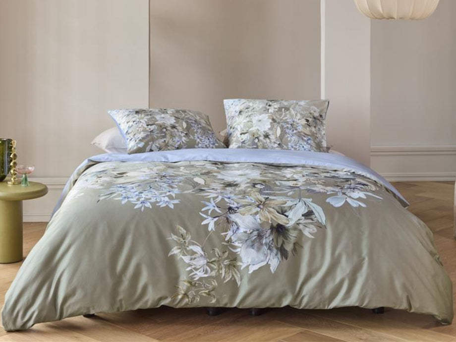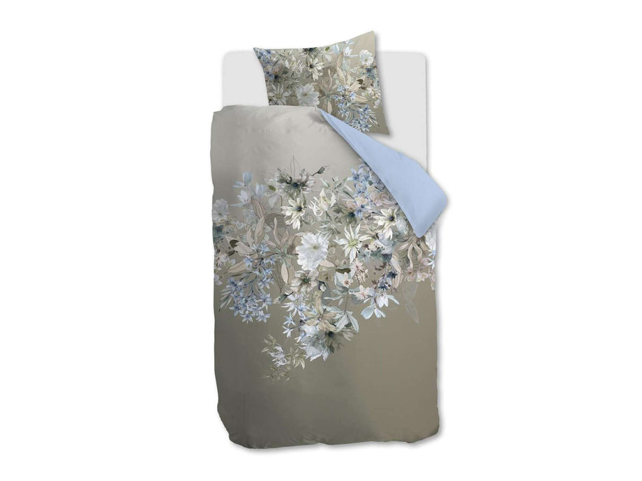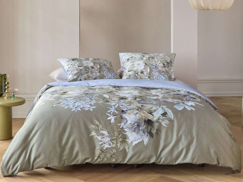 Dekbedovertrek Saffron straalt elegantie en verfijning uit met zijn prachtige bloemenprint. De subtiele overgang van zachte groene tinten naar delicate bloemmotieven in blauwe, witte en beige kleuren geeft het geheel een dromerige en romantische uitstraling. Dit ontwerp brengt een vleugje natuur en sereniteit in je slaapkamer, ideaal voor een rustgevende sfeer.