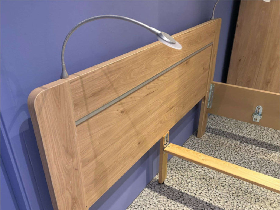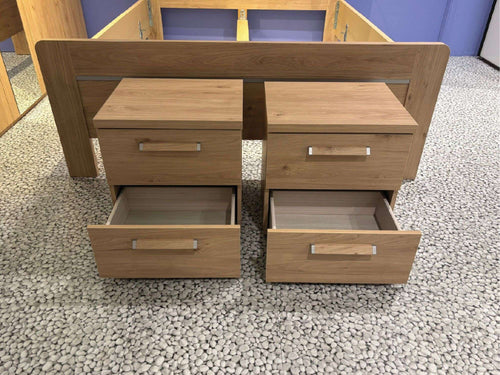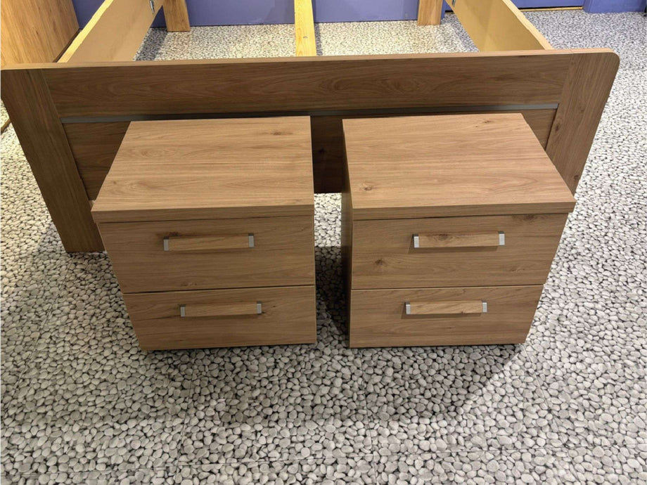 Het frame is vervaardigd uit stevig houtspaanplaat en wordt geleverd exclusief matras en bedbodem, zodat je zelf het slaapcomfort kunt kiezen dat het beste bij jou past. Bij deze showroomset zijn twee nachtkastjes uit de Granada-serie inbegrepen, perfect passend bij het bed voor een harmonieus geheel. Daarnaast is sfeervolle bedverlichting 400 toegevoegd, wat zorgt voor warme en praktische verlichting naast het bed.