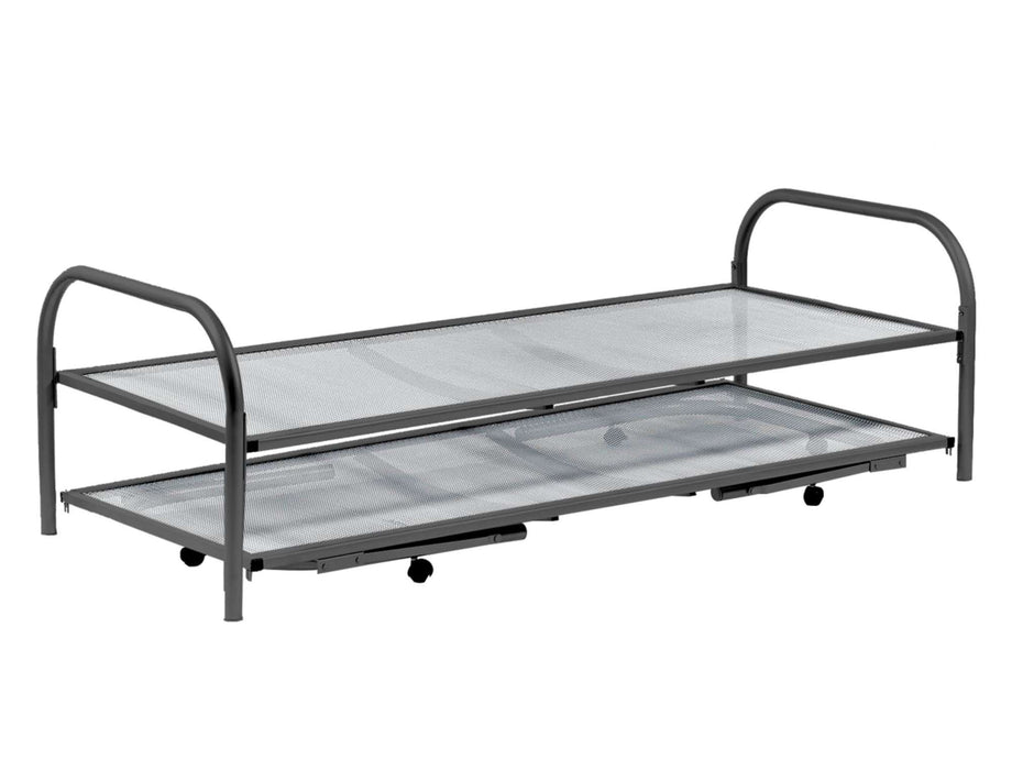 Deze ruimtebesparende dubbeldivan bestaat uit twee losse bedbodems een boven- en onderbed. De twee rondom gespannen spiraalbodems zijn 90 centimeter breed (samen 180 cm) en 200 cm lang. Het onderste bed is eenvoudig in of uit te rollen dankzij de wieltjes die aan de bedbodem zijn bevestigd. Klap je het bed vervolgens uit, dan staat deze stevig op de uitklapbare pootjes.
