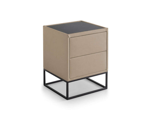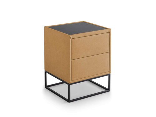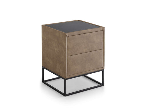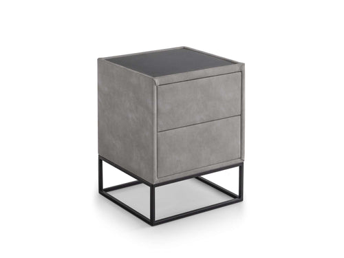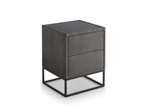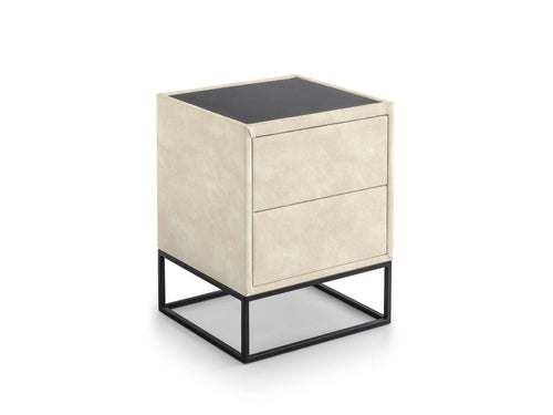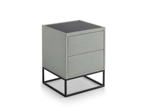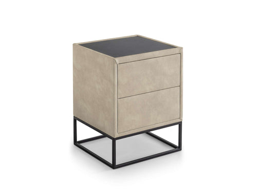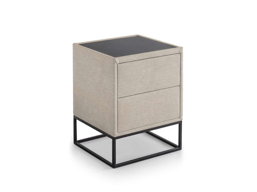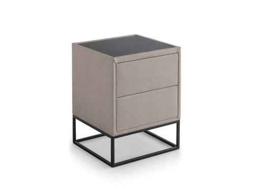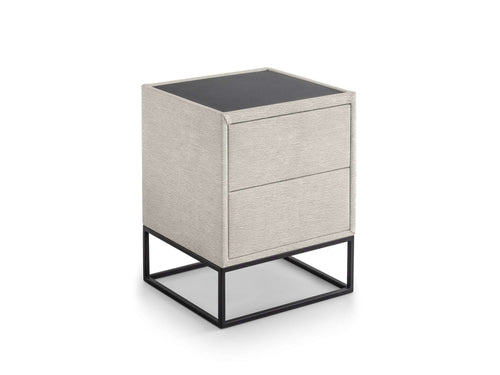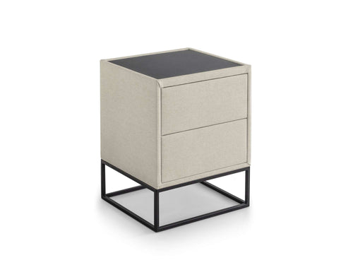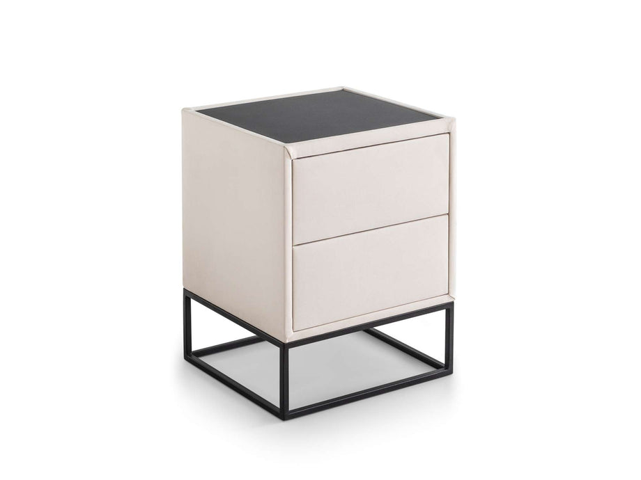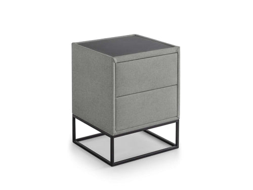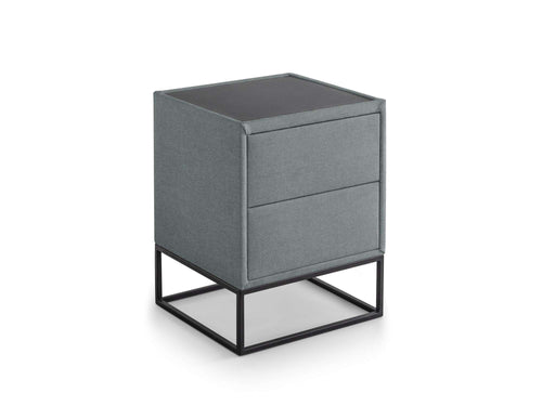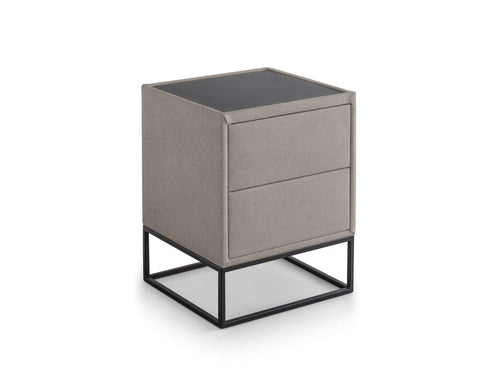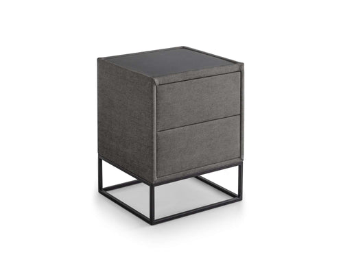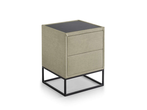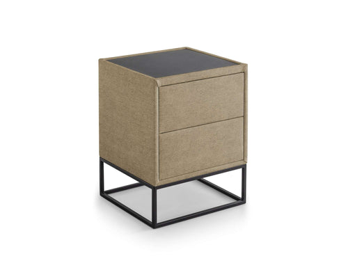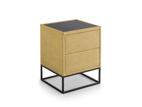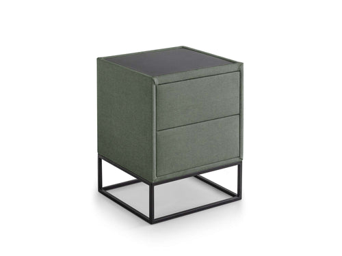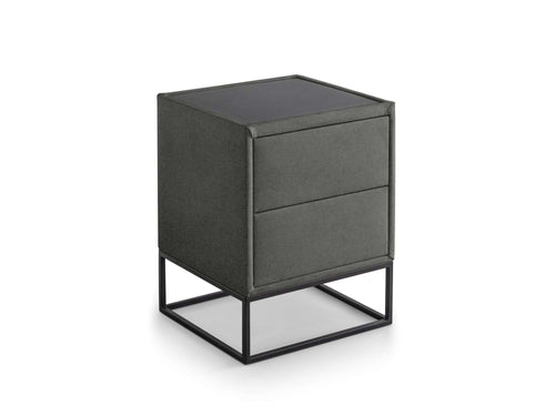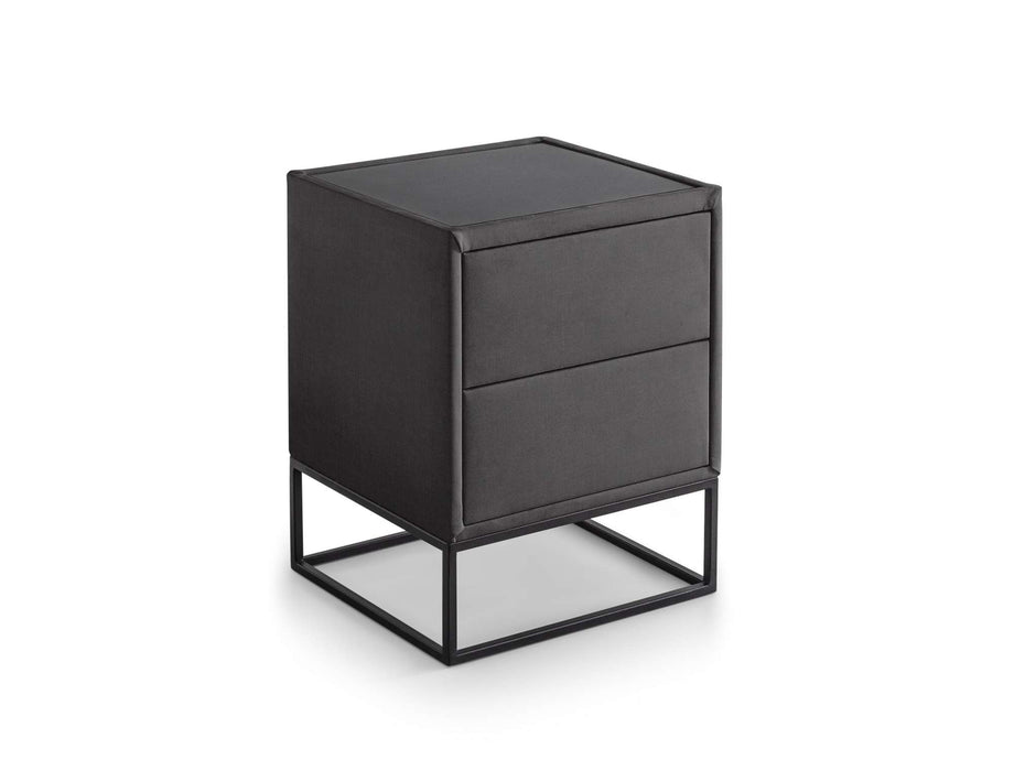 Nachtkastje Dijon straalt moderne elegantie uit en biedt extra opbergruimte met zijn twee ruime lades. De luxe stoffen bekleding en het stevige zwarte metalen frame zorgen samen voor een stijlvolle en eigentijdse uitstraling die perfect past in een moderne slaapkamer.