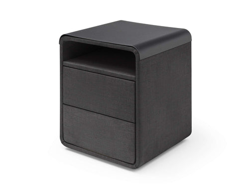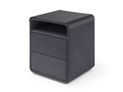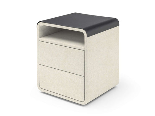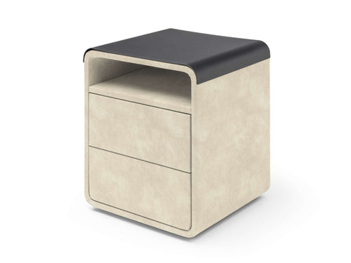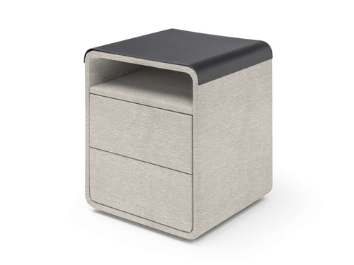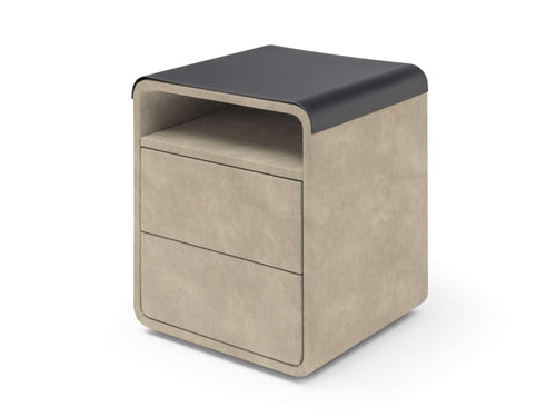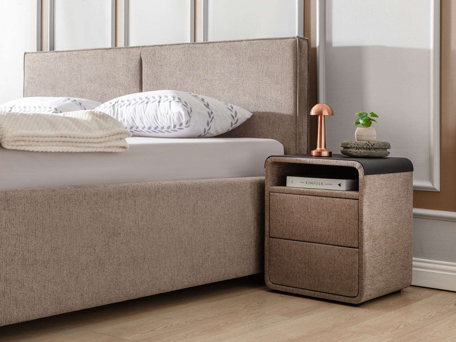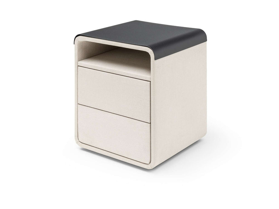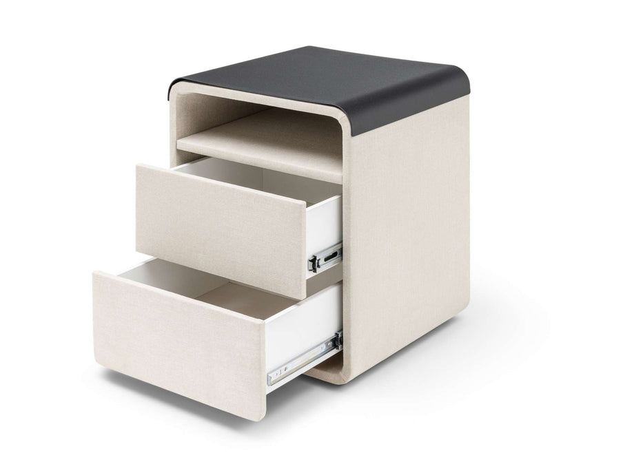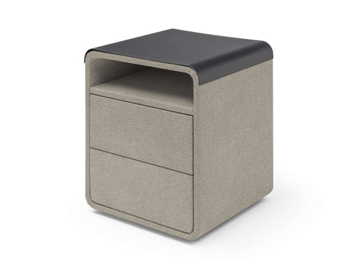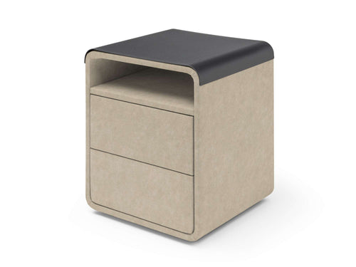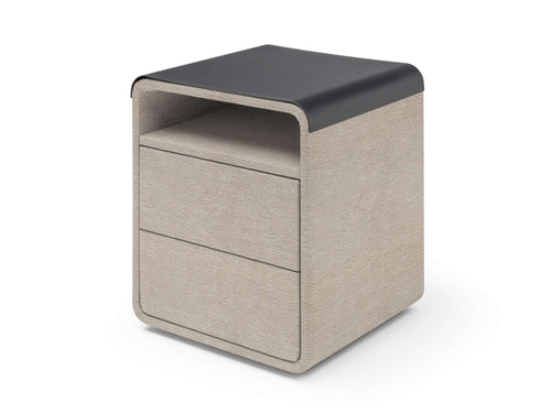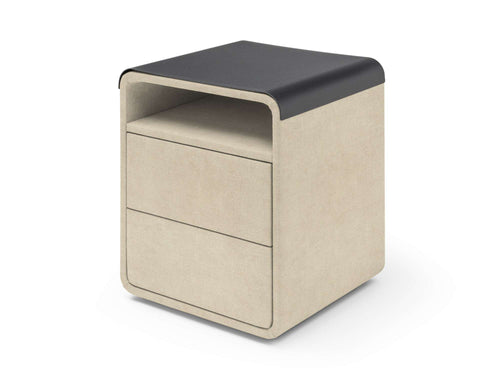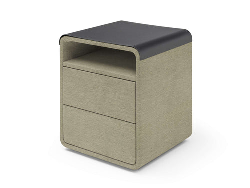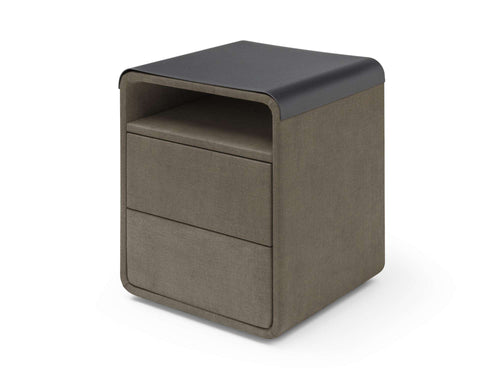 Nachtkastje Fons is de perfecte aanvulling op je slaapkamer. Met zijn strakke, moderne design en subtiele afwerking voegt hij een vleugje elegantie toe aan elke ruimte. De beklede randen geven een zachte, luxe uitstraling, terwijl de metalen afdekplaat zorgt voor een verfijnde look en eenvoudig onderhoud.
