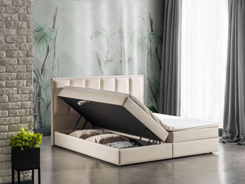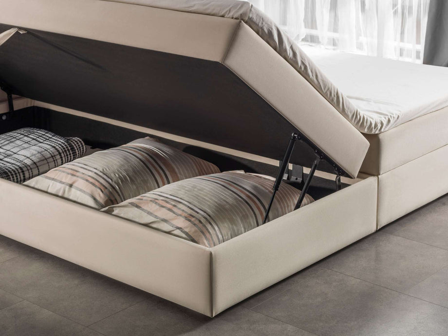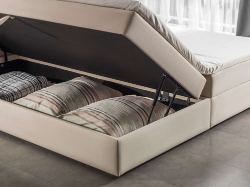 Hoe handig is dit? Een boxspring waarin extra opbergruimte is verwerkt, zonder dat het opvalt. Berg eenvoudig jouw winter- of zomerdekbed, kussens of schoenen op. Zo geniet je van een goede nachtrust, zonder rondslingerde spullen. Opbergboxspring Aken is ideaal voor kleine slaapkamers en bij gebrek aan opbergruimte. De boxspring is voorzien van grote opbergvakken over de hele oppervlakte van de box. De grote deksel open je eenvoudig met een lus aan de zijkant. Aken is ook verkrijgbaar in een uitvoering met opberglades. Ga voor gemak en comfort!