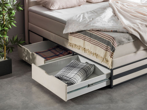 Hoe handig is dit? Een boxspring waarin extra opbergruimte is verwerkt, zonder dat het opvalt. Berg eenvoudig jouw winter- of zomerdekbed, kussens of schoenen op. Zo geniet je van een goede nachtrust, zonder rondslingerde spullen. Opberg boxspring Aken is ideaal voor kleine slaapkamers en bij gebrek aan opbergruimte. De boxspring is voorzien van opberglades, die gemakkelijk te openen zijn. Aken is ook verkrijgbaar in een uitvoering met opbergvakken met een klep. Ga voor gemak én comfort!
