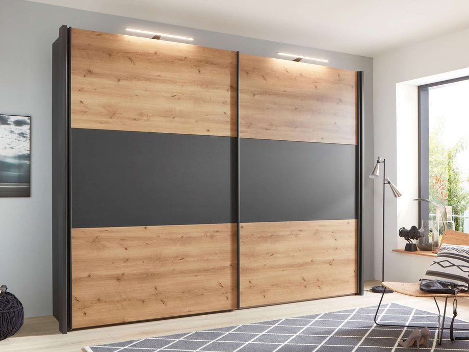 Het kastinterieur van de schuifdeirkast is opgebouwd uit legplanken en een hanggedeelte en beschikt over een grote opbergcapaciteit. De kast heeft een hoogte van 217 cm of 237 cm met een diepte van 67 cm. Voor de breedte van deze kast heb je keuze uit verschillende maten tussen de 200 cm en 330 cm. Kies de afmetingen die het beste in jouw slaapkamer passen.